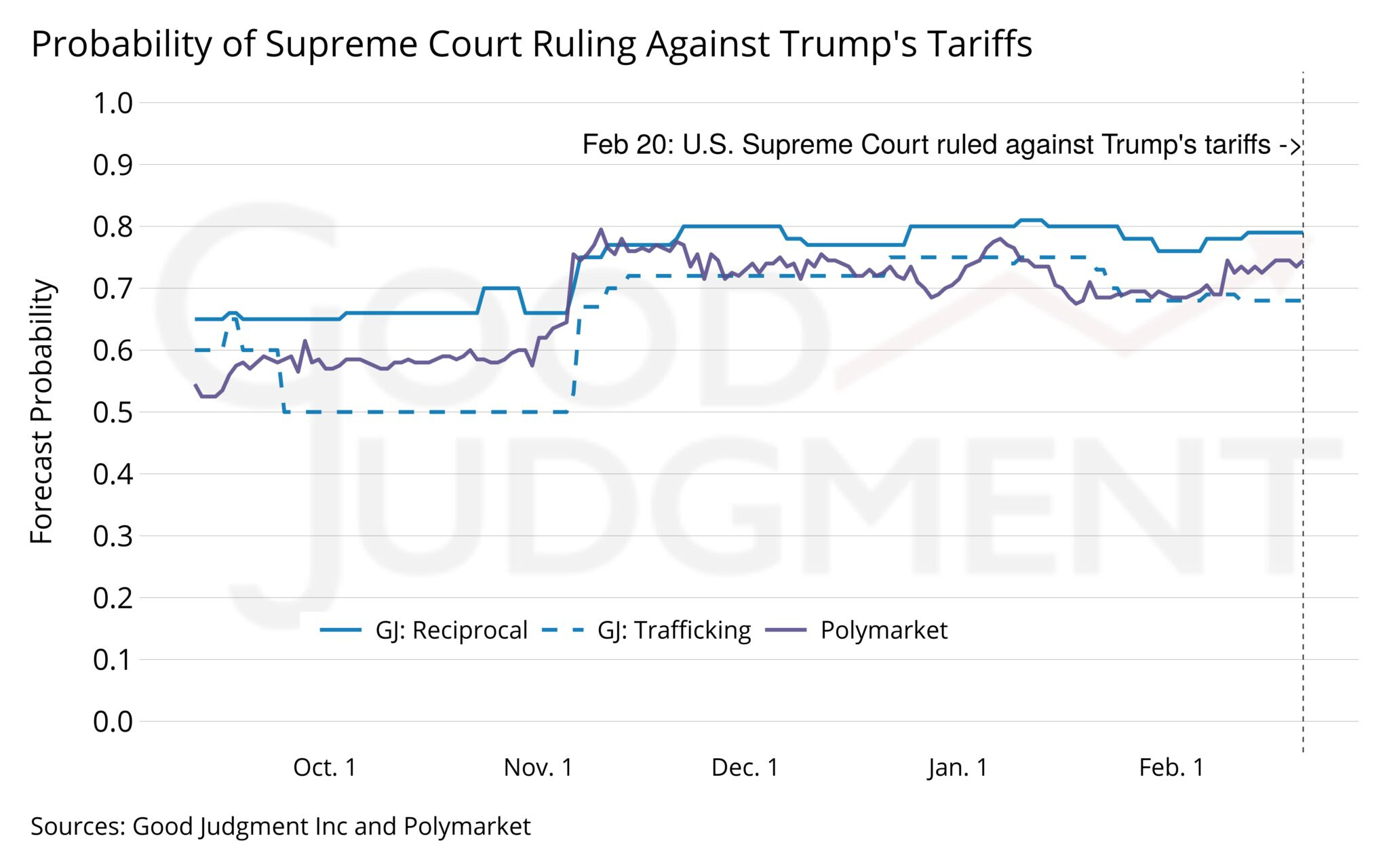 After oral arguments in early November gave insight as to where the Justices’ attention was focused, the two Good Judgment lines converged. By early February, Superforecasters were around 80 percent that the administration would lose on the reciprocal tariffs. Polymarket’s pricing implied something closer to the mid-70s. On 20 February, the Supreme Court ruled against the administration.