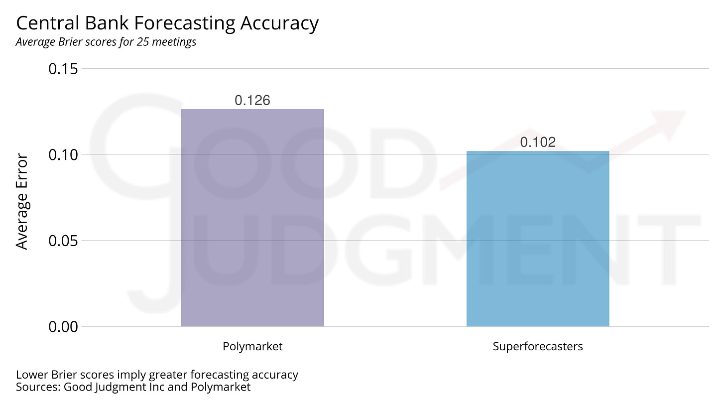 Superforecasting emerged from more than a decade of empirical research, systematic evaluation, and the cultivation of best practices. Polymarket emerged from a very different ecosystem of venture capital, market design, and financial incentives. But origins, pedigrees, and resources ultimately do not decide accuracy. Head-to-head testing on matched forecasting questions does. Central bank rate decisions provide an ideal setting for such an evaluation, which is why we compared Polymarket and Superforecaster forecasts across the full set of 25 recent monetary policy meetings of the Federal Reserve, European Central Bank, Bank of England, and Bank of Japan for which forecasts from both platforms were available.1